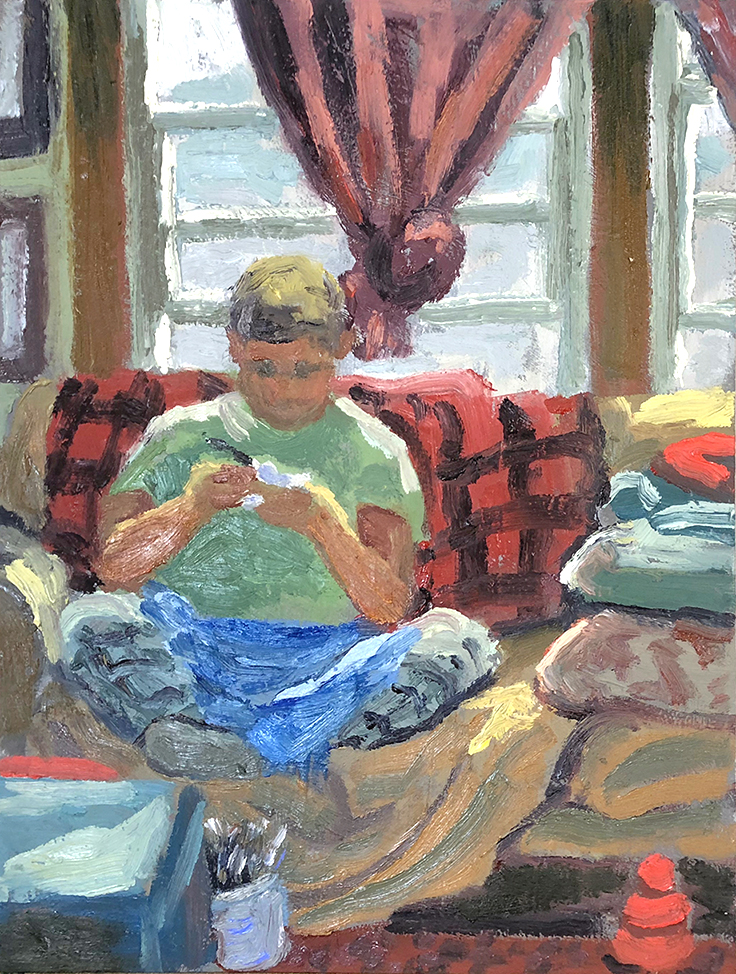 Oil on panel, 9 x 12 Quick study of my partner, Ashley, sculpting prehistoric creatures in polymer clay